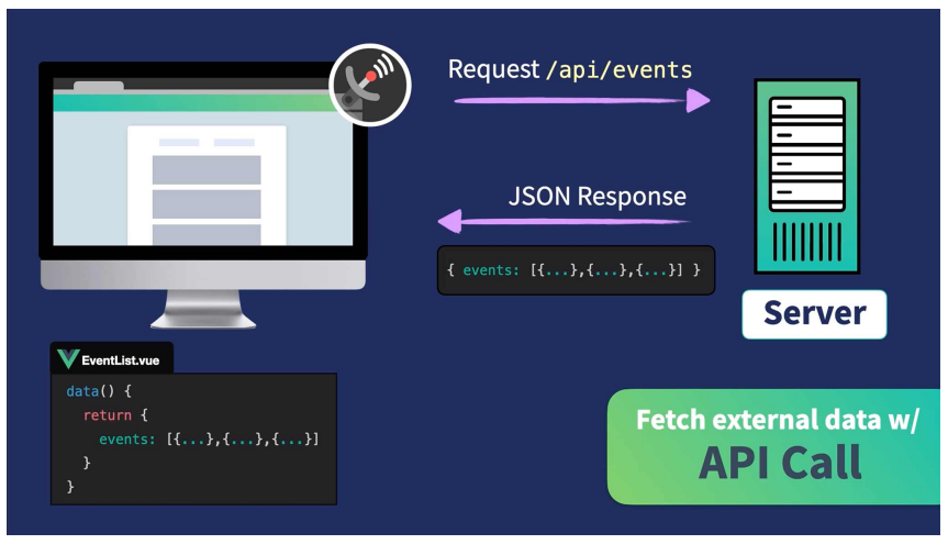 Our app would make a request for the events, the server would respond with those events(as JSON), and we’d take those events and set them as our component’s data, which we then display in the view.