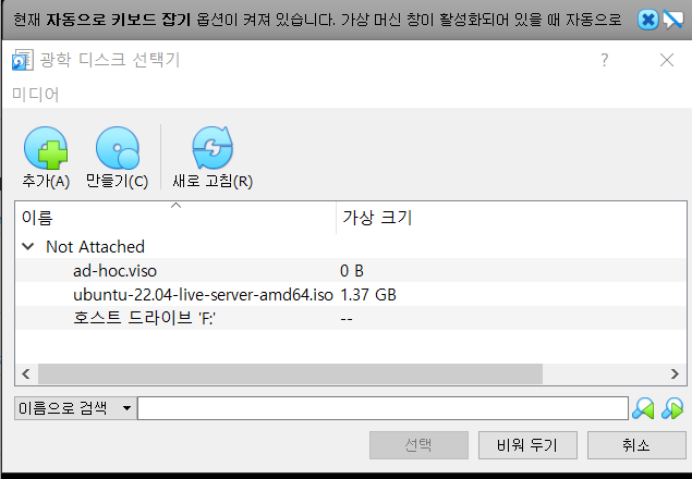 추가를 선택하여 download 받은 iso file 을 선택함.실행히면 선택된 ISO file 이 install 됨.