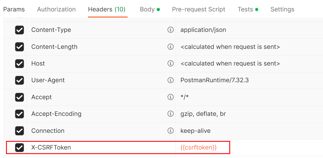 하지만 일반적으로 cookie 는 자주 바뀌기 때문에 바뀐 X-CSRFToken 값을 postman 에서 자동으로 얻어오는 것을 tests tab 에 아래와 같이 작성해야 한다.