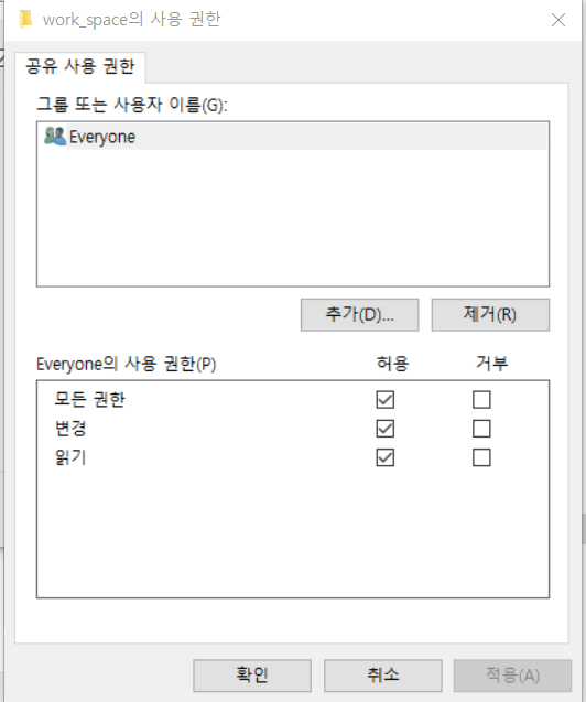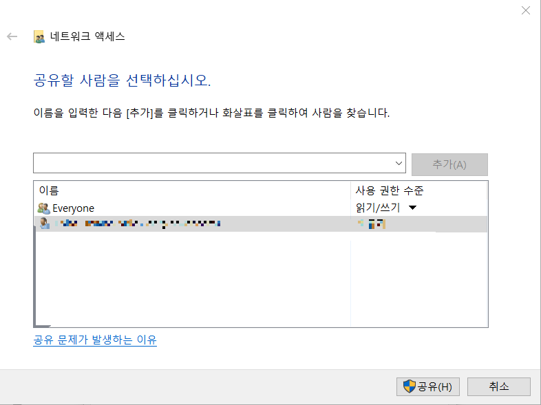 • 속성  선택 -> 공유 tab 선택 -> 공유 button 실행 -> 읽기/쓰기 속성이 있는 everyone -> 공유 button 실행