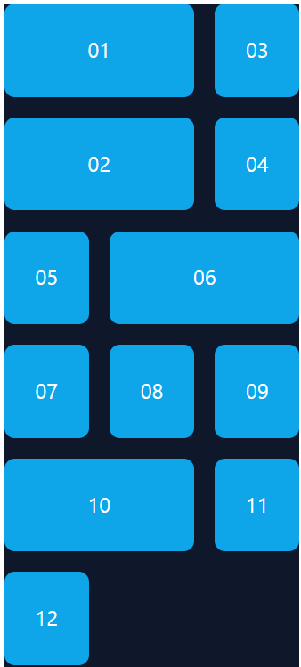 note5) col-span-2 은 two column 을 spanning 하는 것임 . column 이 모두 차면 grid-flow-row-dense 에 따라 다음 row 로 넘어간다.