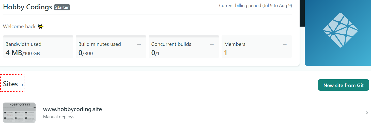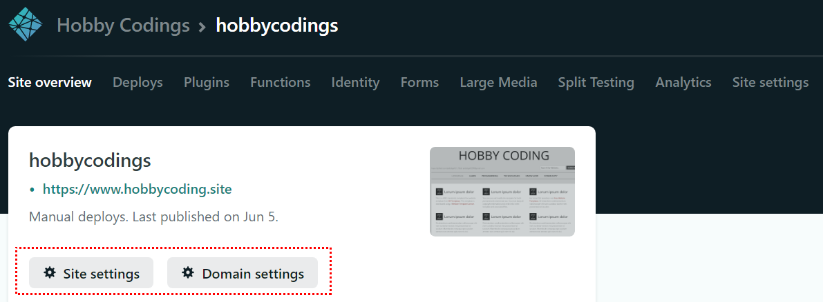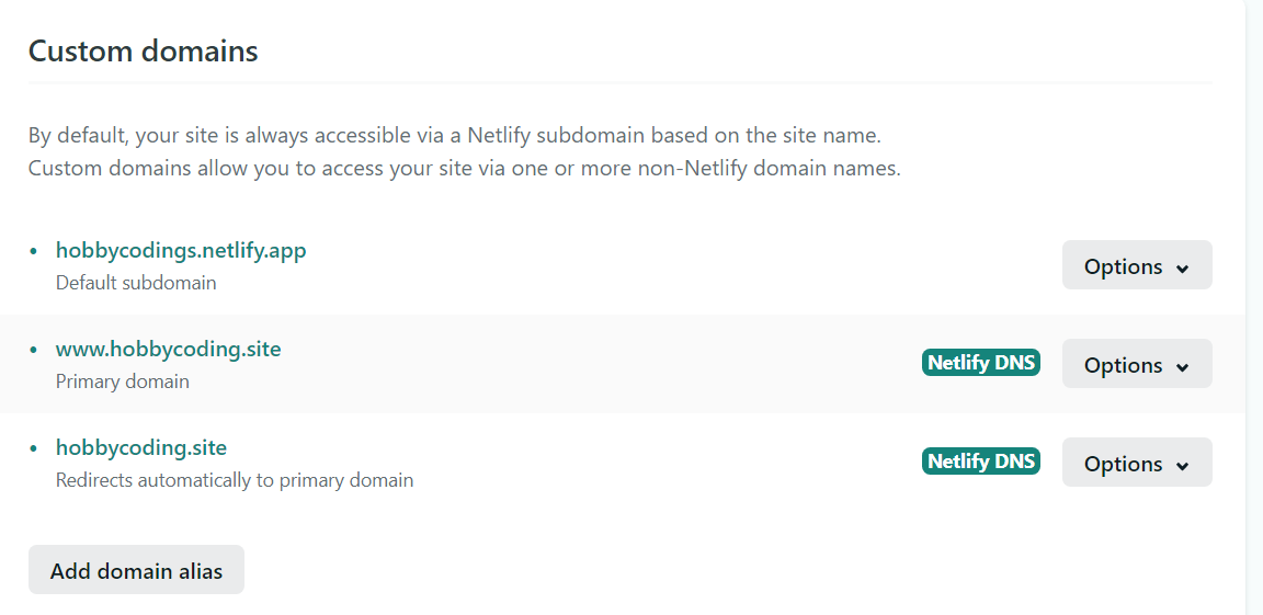 HobbyCodings 으로 site name 을 정하면 https://hobbycodings.netlify.app 와 같이 site link 가 만들어 지고, 구매한 hobbycoding.site 는 Domain Setting 에서 https://hobbycodings.netlify.app 와 hobbycoding.site 을 연결한다.